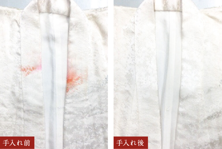 お子さま用のお着物にべったりとついてしまった口紅も、このようにすっきり落とすことができます。年数が経ち、黄色や茶色に生地が変色してしまった場合でもシミ抜きは可能です。