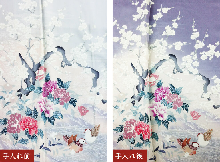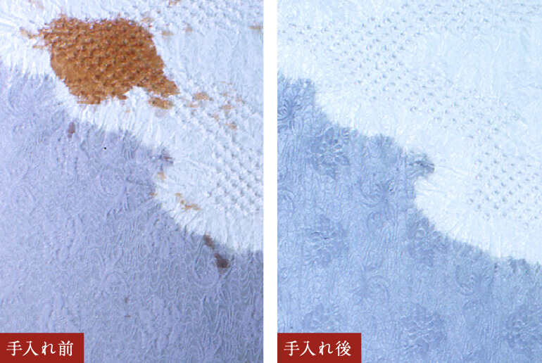 広範囲な汚れや黄変などシミ抜きが難しい場合や、寸法直し後で柄切れが生じた場合など、お好みやご予算に応じて柄足しをおこないます。
