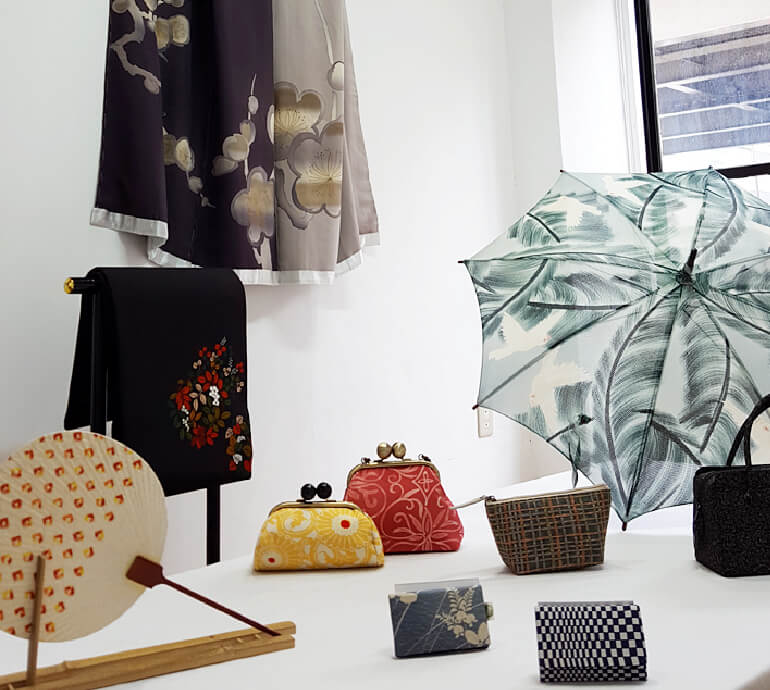 あべのハルカス近鉄本店きものクリニックでは、着物・帯等の着用後のお手入れはもちろんのこと、染め替え、コートや帯への仕立替え、またバックや扇子など小物へのリメークを承っています。